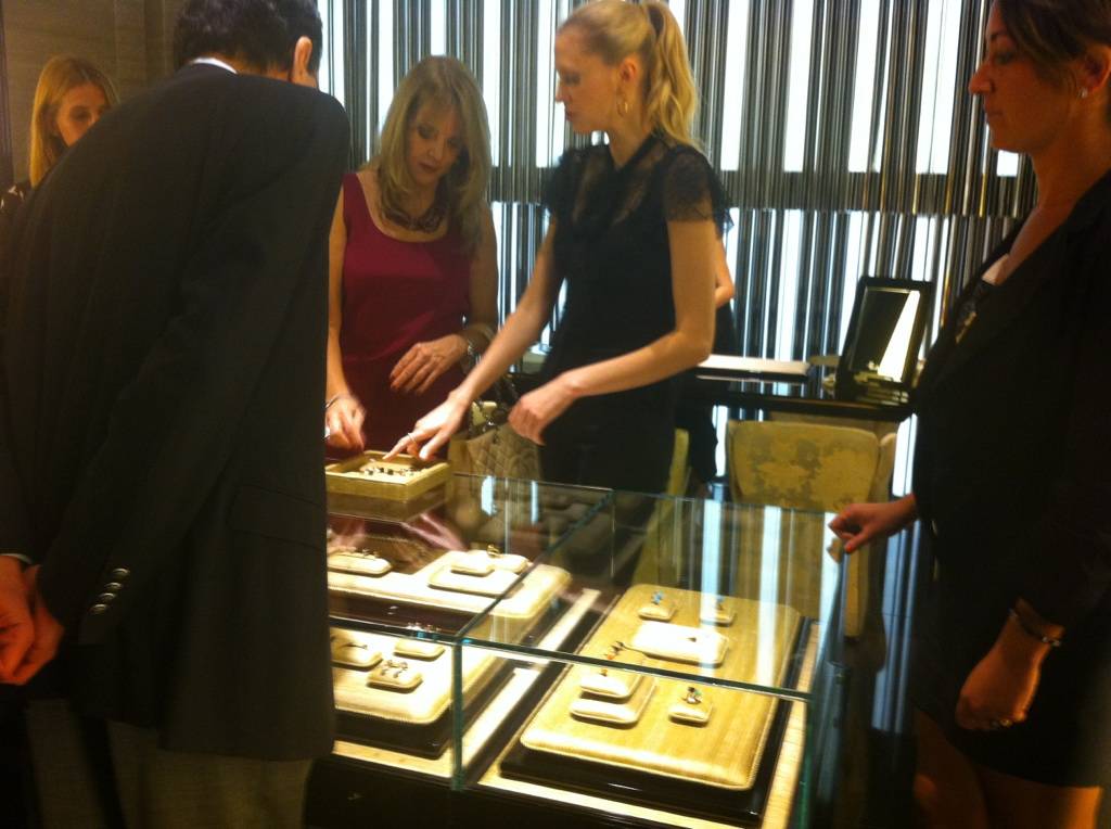 Guests sauntered around the beautiful store–which appropriately looks and feels like a jewel box with its high-sheen black, faceted walls and mirrors and ring band-shaped door handle–trying on pieces from not only the Nudo collection, but all the store’s offerings while sipping on Qream cocktails and nibbling on bites from Le Basque.