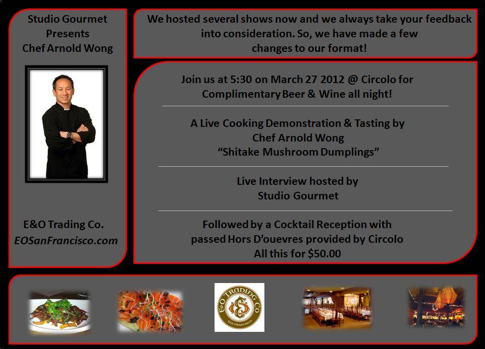 Tonight, executive Chef Arnold Wong from E&O Trading Co. will be participating in Studio Gourmet. Held at Circolo, Arnold will hold a cooking demo showcasing Shitake Mushroom Dumplings for guests to enjoy, followed by a live interview. After the interview, guests are invited to a cocktail reception with light bites and beer and wine. The evening begins at 5:30pm and is priced at $50. Guests can purchase tickets online. http://www.studiogourmet.eventbrite.com