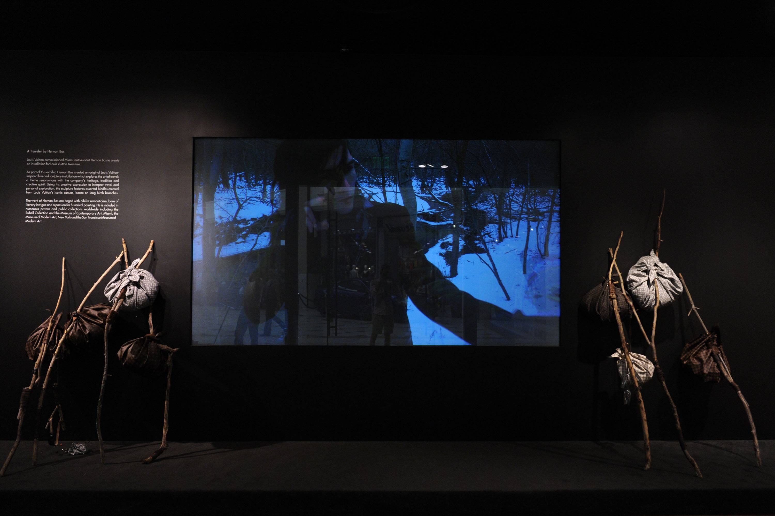 In a nod to the present and future, Bas also incorporated technology, producing a Louis Vuitton-inspired film that spoke to the sculpture installation; featuring his version of a traveling nomad, transversing a forest, Louis Vuitton bindle in tow.