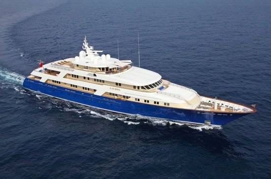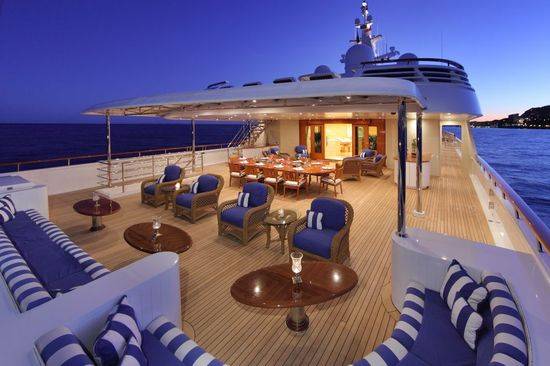 The exterior, interior space planning and interior design were all styled by Donald Starkey. The main deck is furnished with s ample outdoor seating, the main saloon is situated around an octagonal carpet and the dining room, with its large windows on both sides, redefines fine dining. The master stateroom offers two outside terraces, port and starboard side guest cabins are all located on the lower deck with large en suite bathrooms. The yacht is spacious enough to accommodate a total of 14 guests and 25 crew.