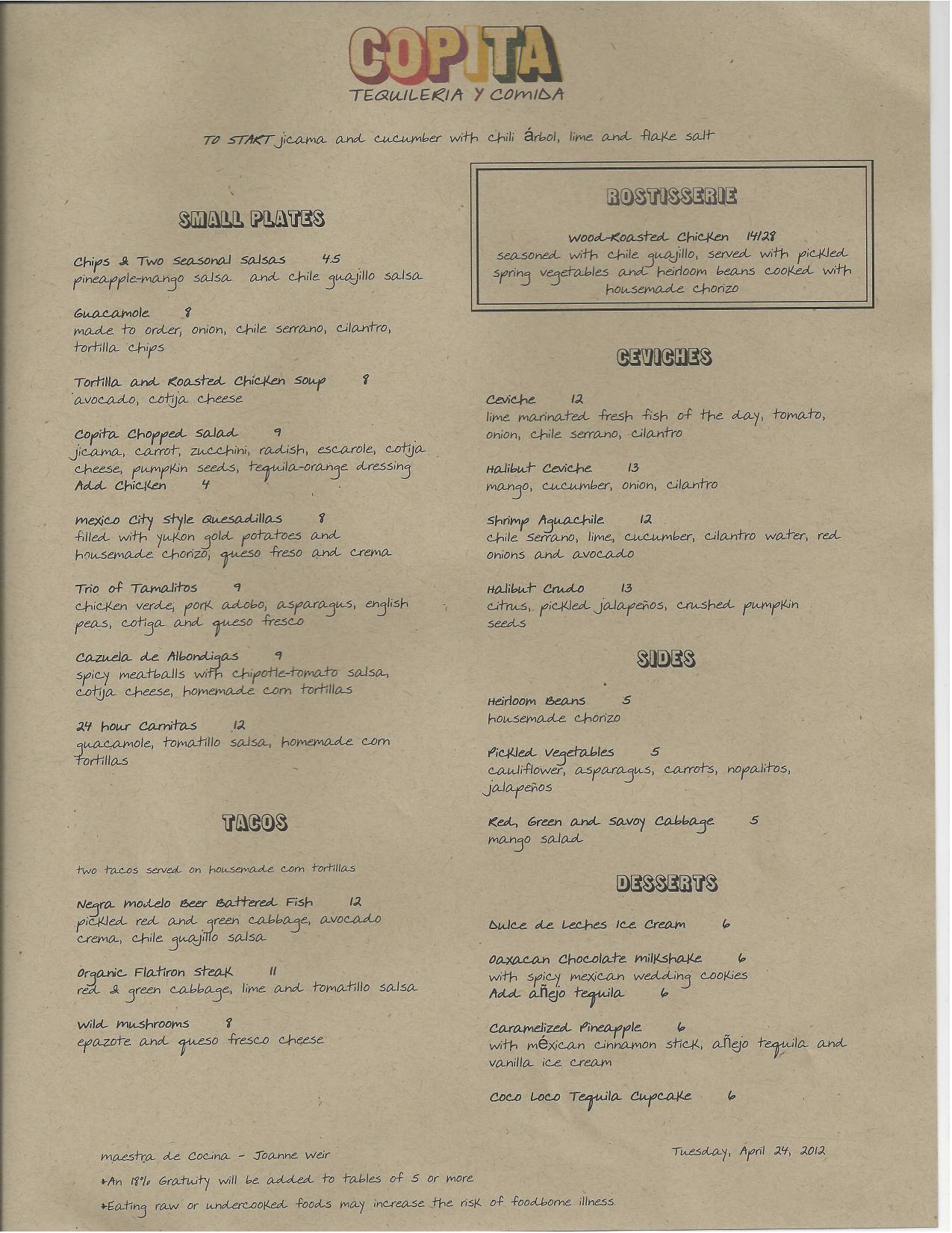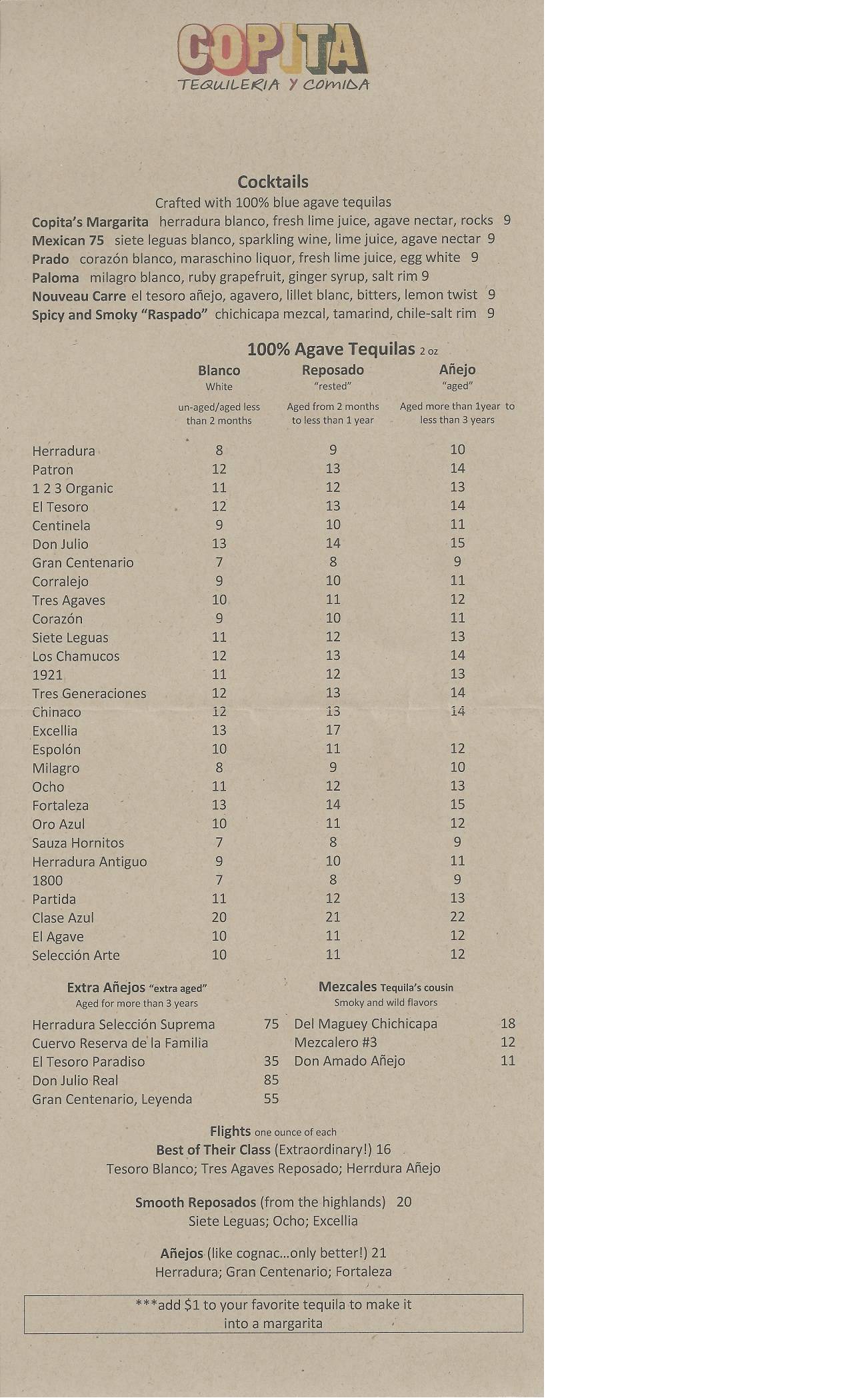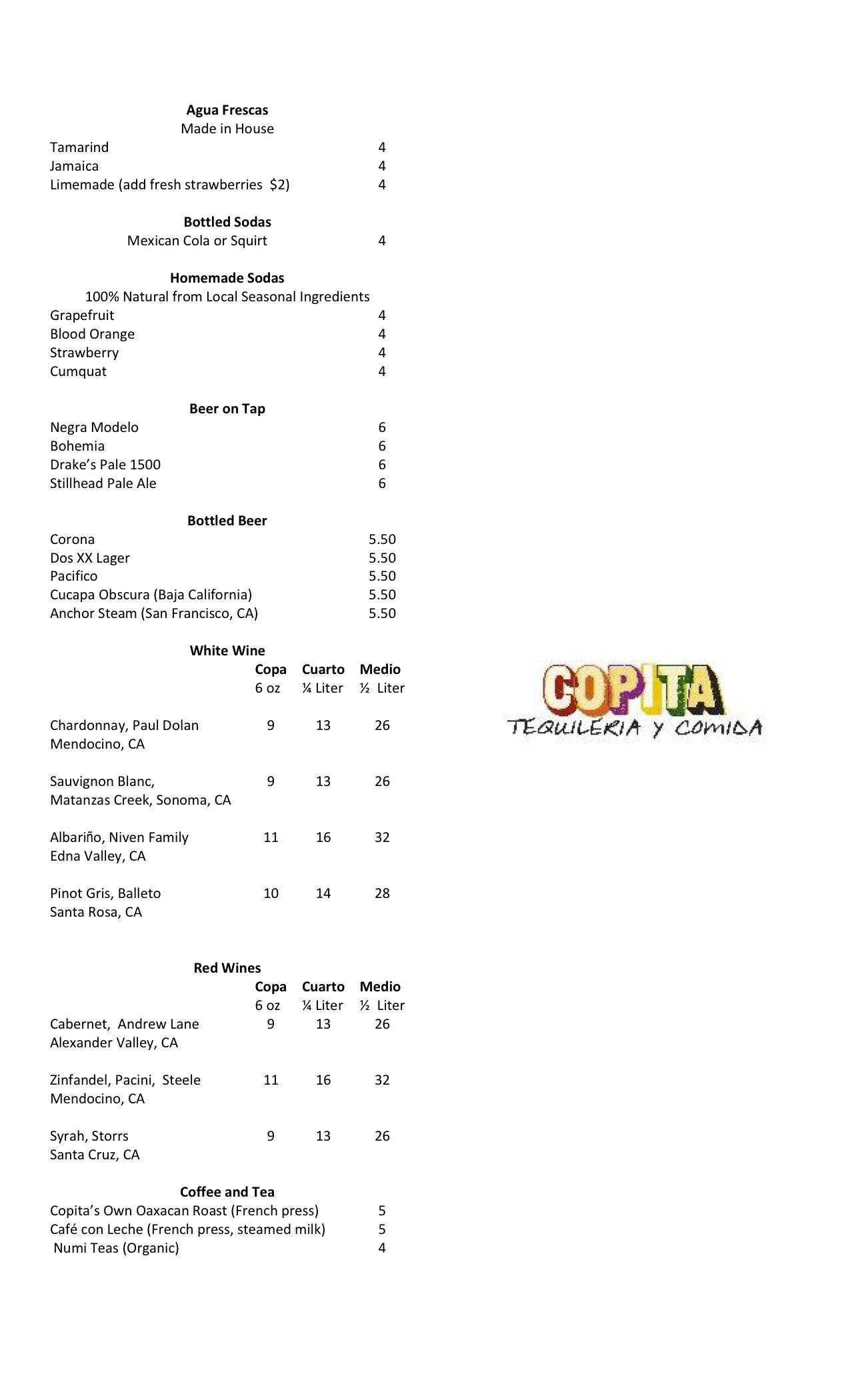 Copita is open for lunch and dinner daily in the dining room, bar, and outdoor patio.