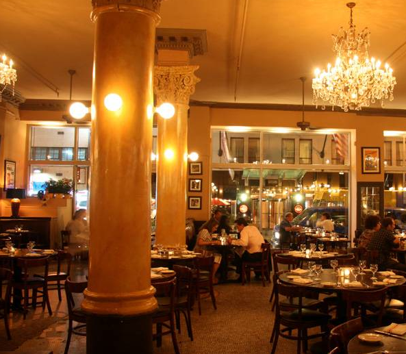 The decor, designed by Pierre Hittier, is classic world class French restaurant style with original detailed mosaic flooring, globe lighting fixtures, four magnificent Ionic, Corinthian and Composite order columns, three Hungarian artisan crystal chandeliers, cozy deep seated leather banquettes and 18 ft. glass windows.
