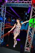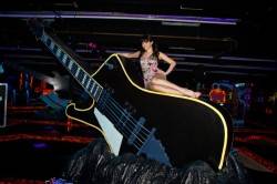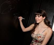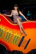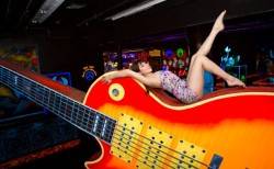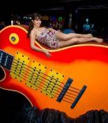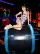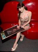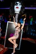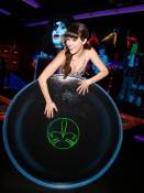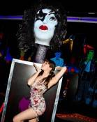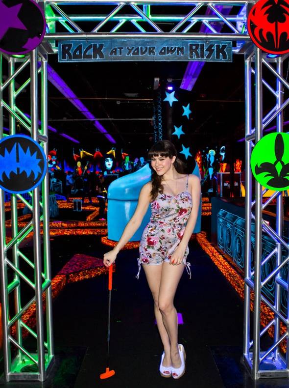 Sinclair donned a Bettie Paige outfit as she made her way through the black lit KISS-themed rock and roll mini golf maze, where she even putted with a blindfold on. She rocked out to KISS music and golfed before heading into the VIP lounge, where she signed the wall of fame elder door and photos from her KISS by Monster Mini Golf photo session.