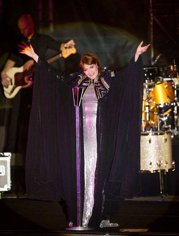 On Saturday night, Florence + The Machine kept the Cosmopolitan of Las Vegas’ summer concert series going with a sold-out show at the resort’s Boulevard Pool. The English-born Florence Welch appeared with a seven-piece band including Chris Hayden (drums), Isabella Summers (keyboards), Rob Ackroyd (guitar), Mark Saunders (bass) and Tom Monger (harp).