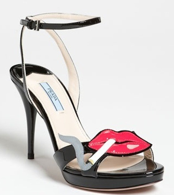 The mega design house has just released a wild pair of patent leather strappy sandals with giant pink lips on the toe and a dangle smoking cigarette with plumes of smoke.