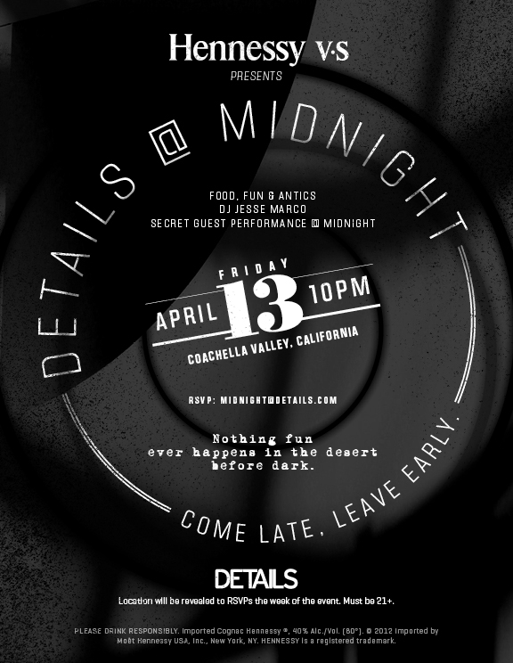 This Friday he teams up with Hennessy VS and Details @ Midnight. The midnight concerts by Details Magazine highlight the hottest music talents today, including Theophilus London and Kid Cudi. This Friday’s concert will be a must for Coachella goers.