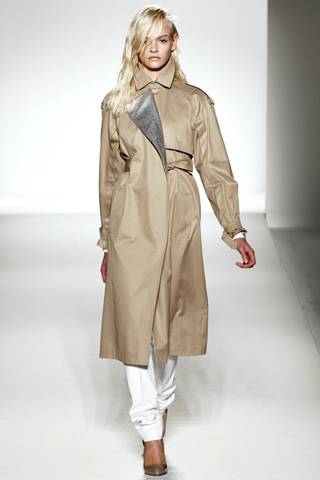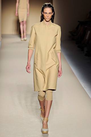 The Max Mara collection is made up of athletic silhouettes in tan, white and aqua. The key piece is a pair of knee-length capris, worn alone or under jackets and skirts. Hints of gold in trench coats and shorter sportswear-inspired jackets add the perfect touch of glamour to the collection.