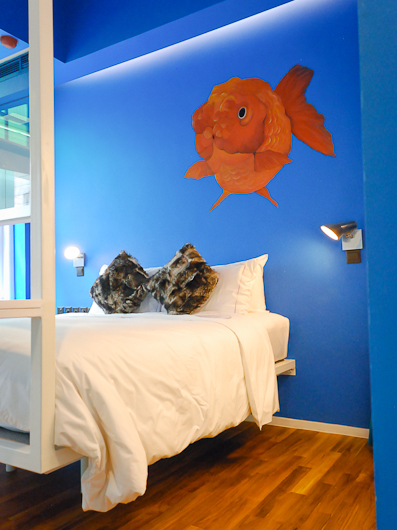 Design is the main focus at this chic hotel. One room features a floating bed with blue painted walls and a bloated goldfish floating over the bed. The room is modern with hanging lights and a balcony with an outdoor bathtub.