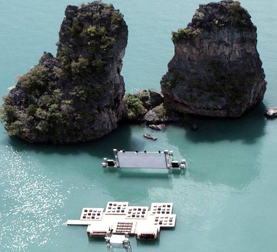 Located in the private island of Yao Noi in Andaman Sea, Thailand, a unique floating movie theater has been temporarily installed. Designed by architect Ole Scheeren in collaboration with the Film on the Rocks Yao Noi Foundation, the floating cinema is nestled in front of limestone protrusions of the Andaman.