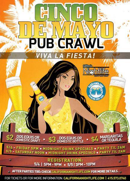 Cinco de Mayo Pub Crawl in the Marina:  Legendary to knock down the brawniest of Marina men, this pub crawl isn’t for the faint of heart.  Sneakers and flats are strongly suggested as the crawl starts at Bar None on Friday 5PM but really starts at noon on Saturday through 9PM.  There’s Dos Equis, Patron and Tecate:  all your favorite Mexicans.  Tickets are available here.