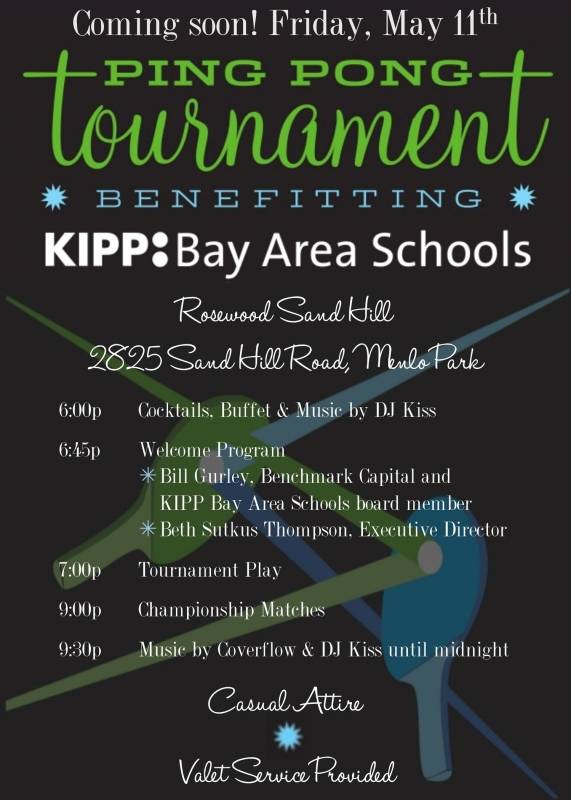 Join the festivities on Friday, May 11, when over 400 competitors from Bay Area tech companies, venture firms and individual teams face off for the first-ever Ping Pong Tournament to benefit KIPP Bay Area Schools.
