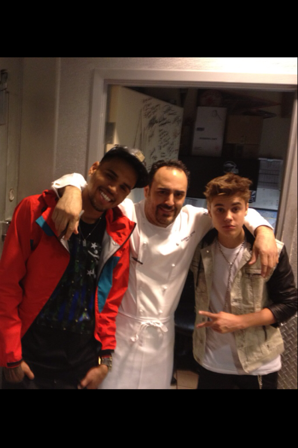 Bieber and Brown both started off with N9NE’s signature rock shrimp, followed by an 8-ounce filet for Bieber and Surf n’ Turf for Brown. The table shared N9NE’s signature mac and cheese and lobster mashed potatoes. Following dinner the duo stopped by the kitchen to see N9NE’s executive chef Barry Dakake and to add their signatures to his famous “shakedown door” covered with other A-lister names who have visited the steakhouse.
