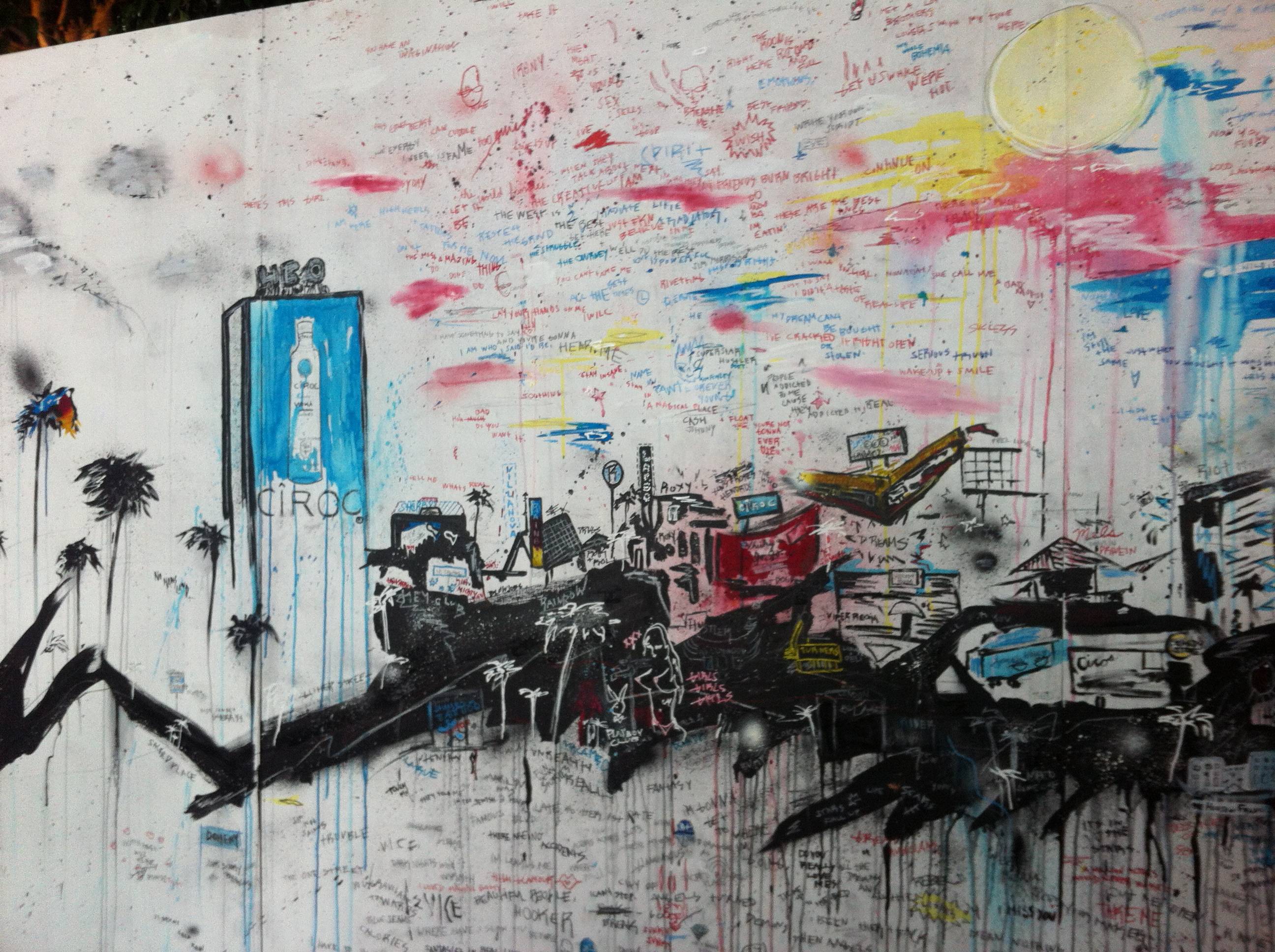 As they entered, guests were wowed by a Gregory Siff painting on the step and repeat titled, “Till the End of Time (Sunset Strip).” Painted with blue ink mixed with Ciroc Vodka, spray paint, acrylic, crayon, pencil, marker and etching, the landmarks of the Sunset Strip between Doheny and Crescent Heights were honored.