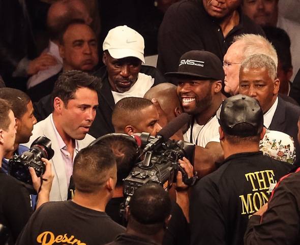 Justin Bieber and 50 Cent walked The Money Man into the ring at the MGM Grand Garden Arena. Other celebrities at the fight included Mike Tyson and his wife Kiki, Bill Paxton, Anna Paquin and Stephen Moyer of “True Blood” and Pierce Brosnon.