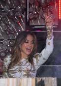 After performing a concert at Mandalay Bay, the multitalented singer, actress and designer headed over to the nightclub at the Bellagio. The star was escorted through the casino by golf cart and accompanied by a large entourage including boyfriend Casper Smart. She arrived on the red carpet in style wearing a stunning cream and gold sequined ensemble complete with sparkly Chrisitan Louboutin heels.
