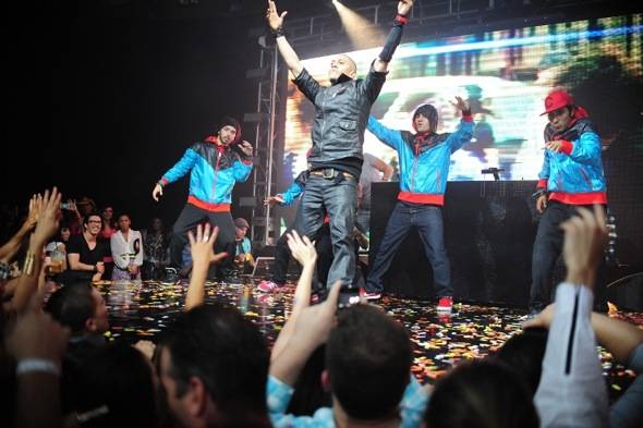 Taboo of Taboo of Black Eyed Peas had an explosive performance at Rain Nightclub. Arriving in all black but accenting it with red, Taboo showed off his red studded belt, glasses, watch and even red shoe laces. The Taboo Experience started with Taboo in line with five break dancers dancing and singing to “Pump It” by Black Eyed Peas. The explosive performance continued when Taboo took to the turntables. On the microphone he yelled, “Las Vegas, let me hear you scream,” and simultaneously the famed three-foot fireballs Rain is known for, shot from the ceiling making the crowd go wild.