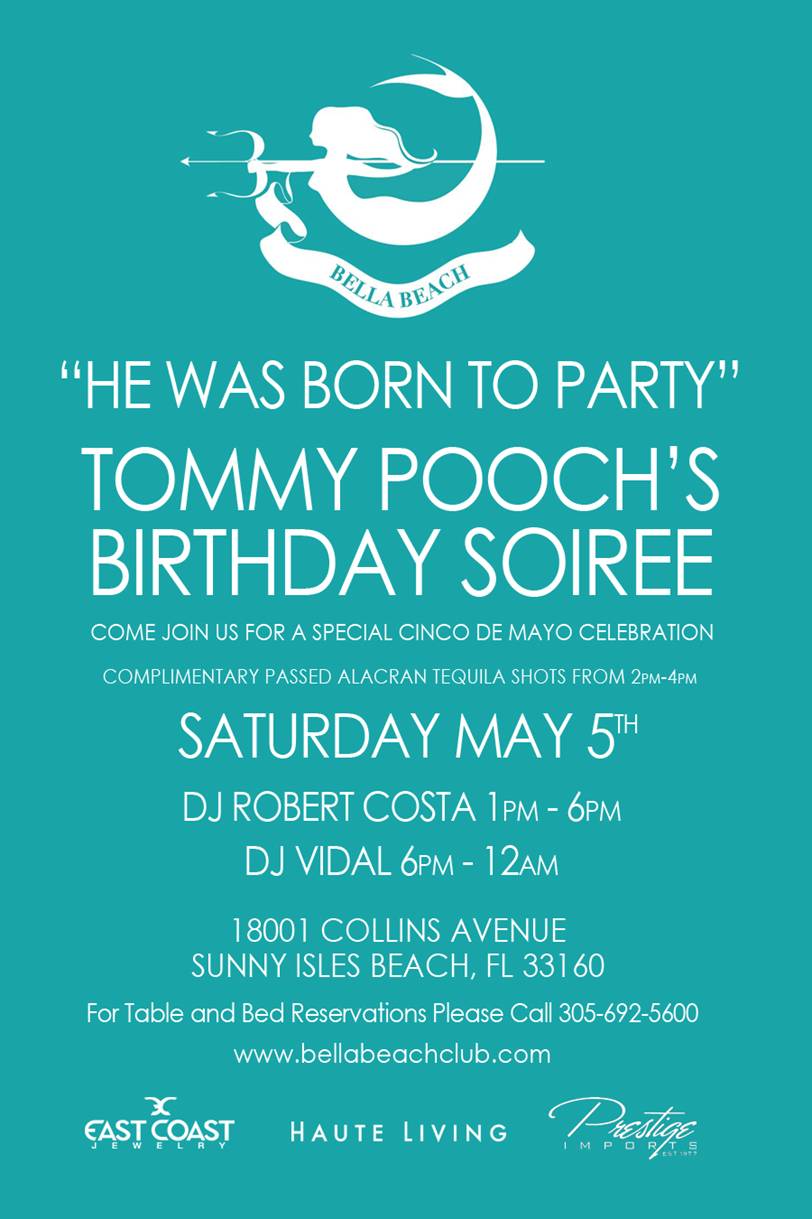 This Cinco de Mayo, come party with Tommy Pooch for his “He Was Born To Party” Birthday Soiree at Bella Beach Club. There will be complimentary alacran tequila shots from 2 to 4 pm with DJ Robert Costa dropping beats from 1 to 6 p.m., and DJ Vidal keeping the party going from 6 p.m. to 12 a.m.