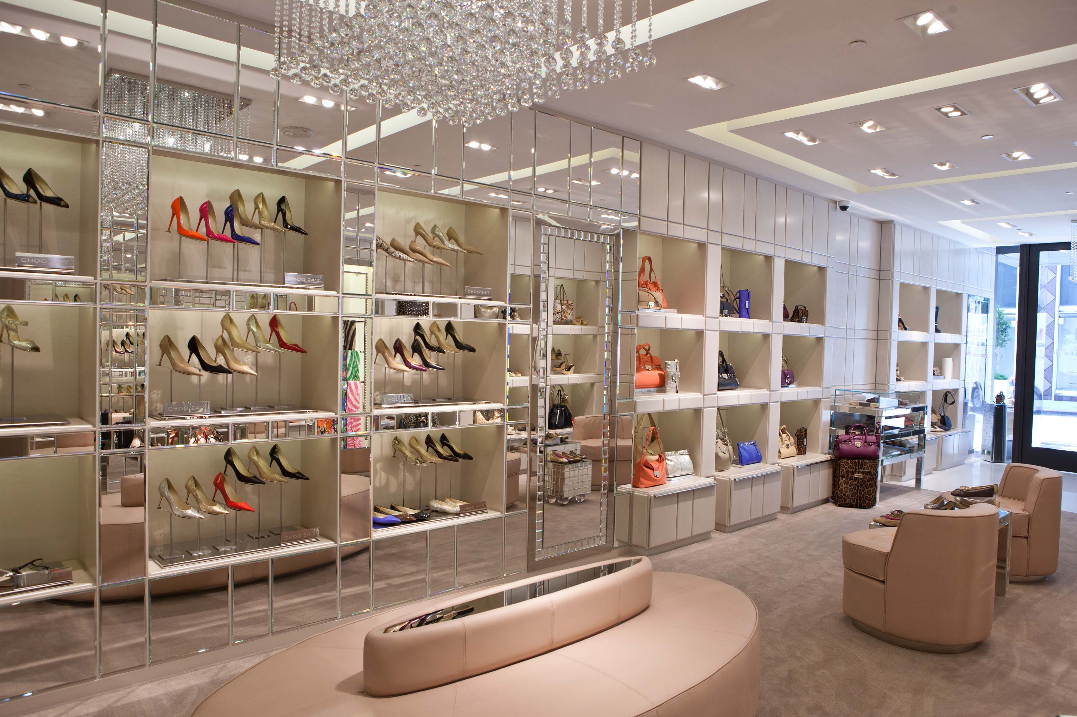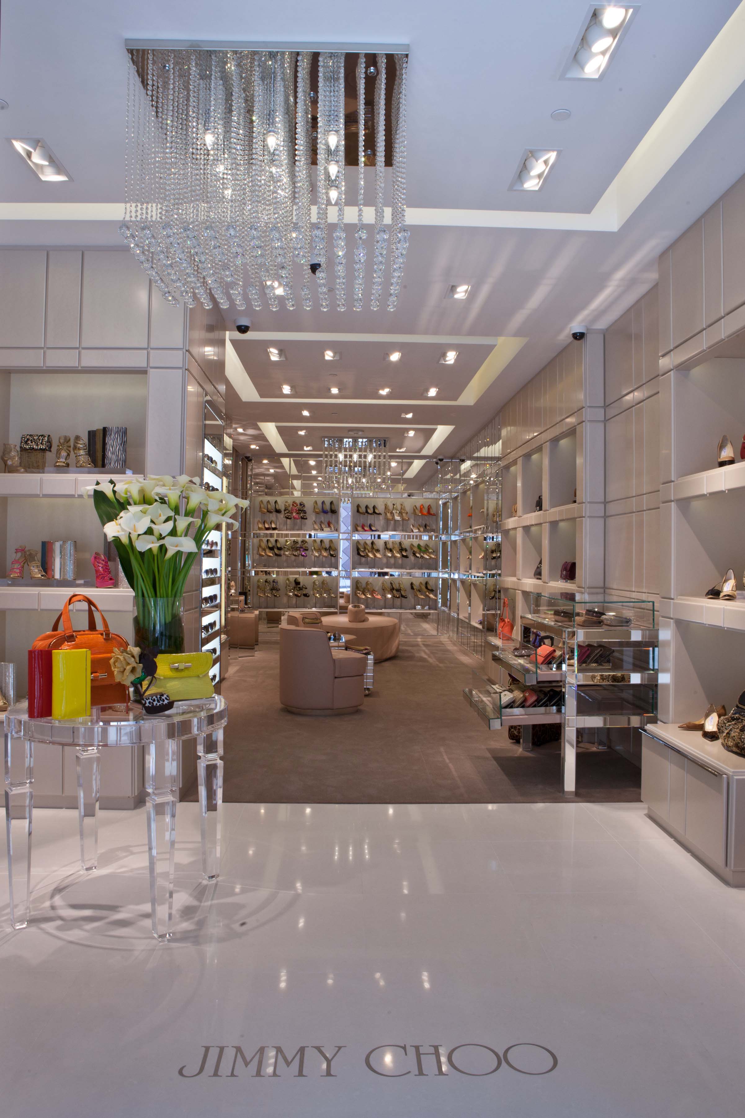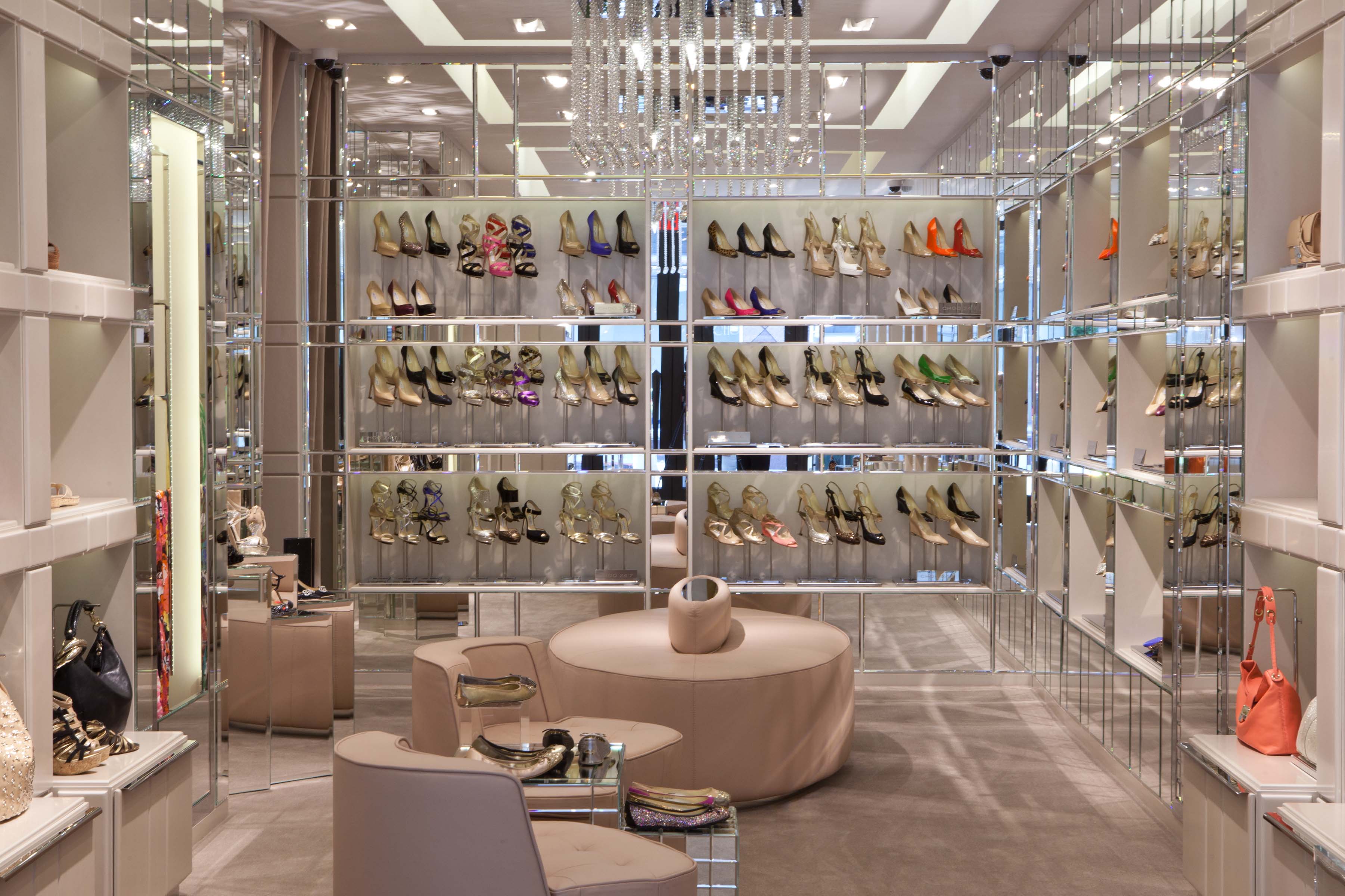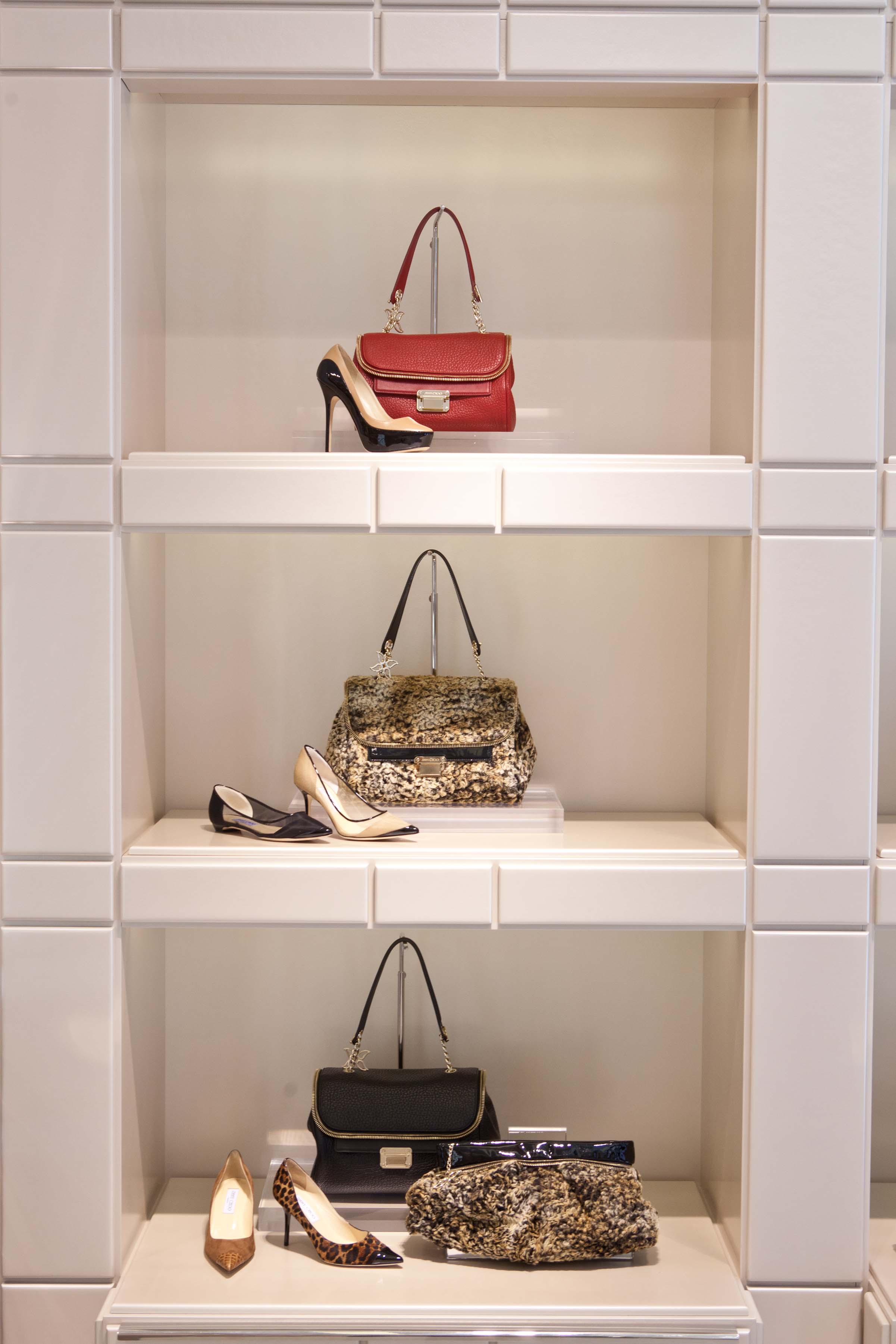 Decorated in the company’s iconic motif, the 1700 square foot boutique features an enlarged collection of Jimmy Choo women’s shoes, handbags, small leather goods, soft accessories, belts, sunglasses and fragrance in an intimate, luxurious setting. The interior is set up as a series of intimate salons, evoking the architectural glamour of a 1940s boudoir. The neutral beige interior color scheme is a harmony of ivory, pale rose, lilac and sand, in keeping with the brand’s signature colors. Decorative elements of the interior include lush tufted seating, mirrored tables, crystal drop chandeliers and niches upholstered in reflective finishes.