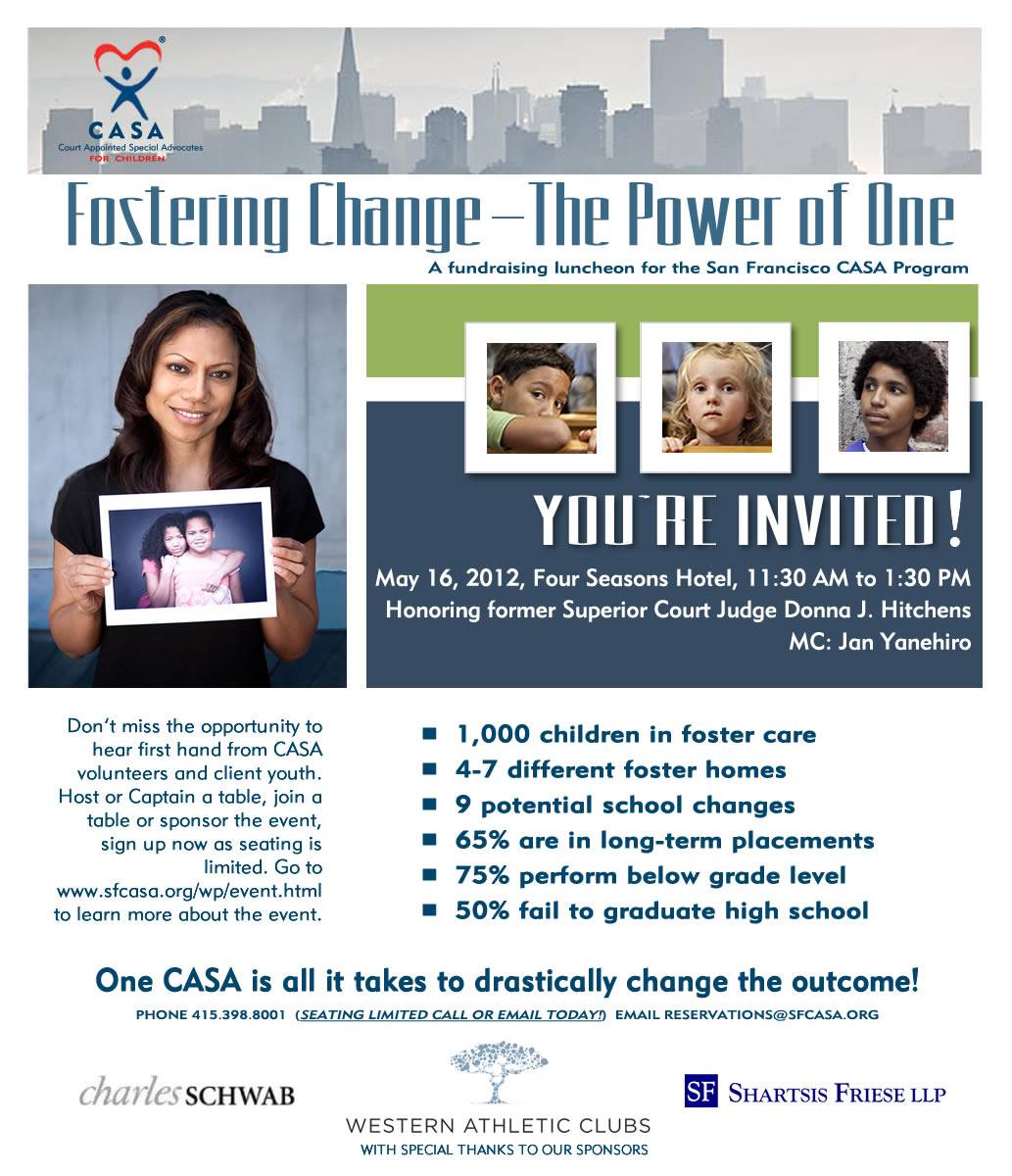 Join NFL Superstar Marshawn Lynch and the San Francisco CASA (Court Appointed Special Advocates) Program tomorrow, May 16th as they celebrate SF CASA’s annual “Fostering Change–The Power of One Luncheon” in honor of retired Superior Court Judge Donna Hitchens.