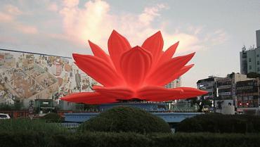 Possibly the most visible and ambitious piece in the exhibition is the 24-foot tall red lotus sculpture called “Breathing Flower”, which stands in San Francisco’s Civic Center Plaza. The art piece, created by Korean artist Choi Jeong Hwa, is the symbol for the ancient Asian’s devotion of spiritual illumminatino and renewal.