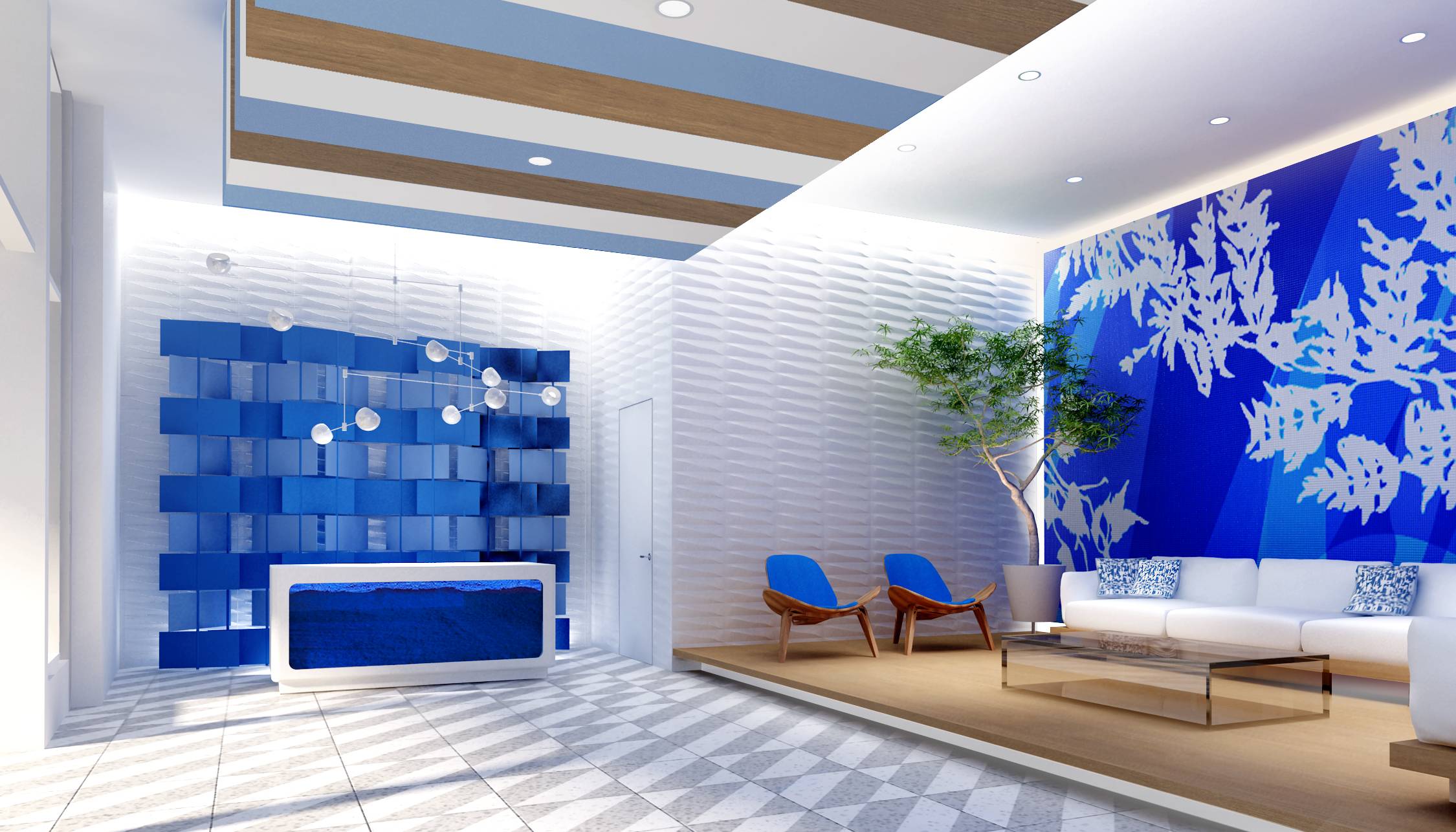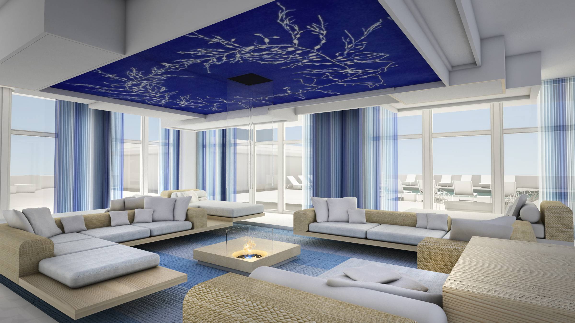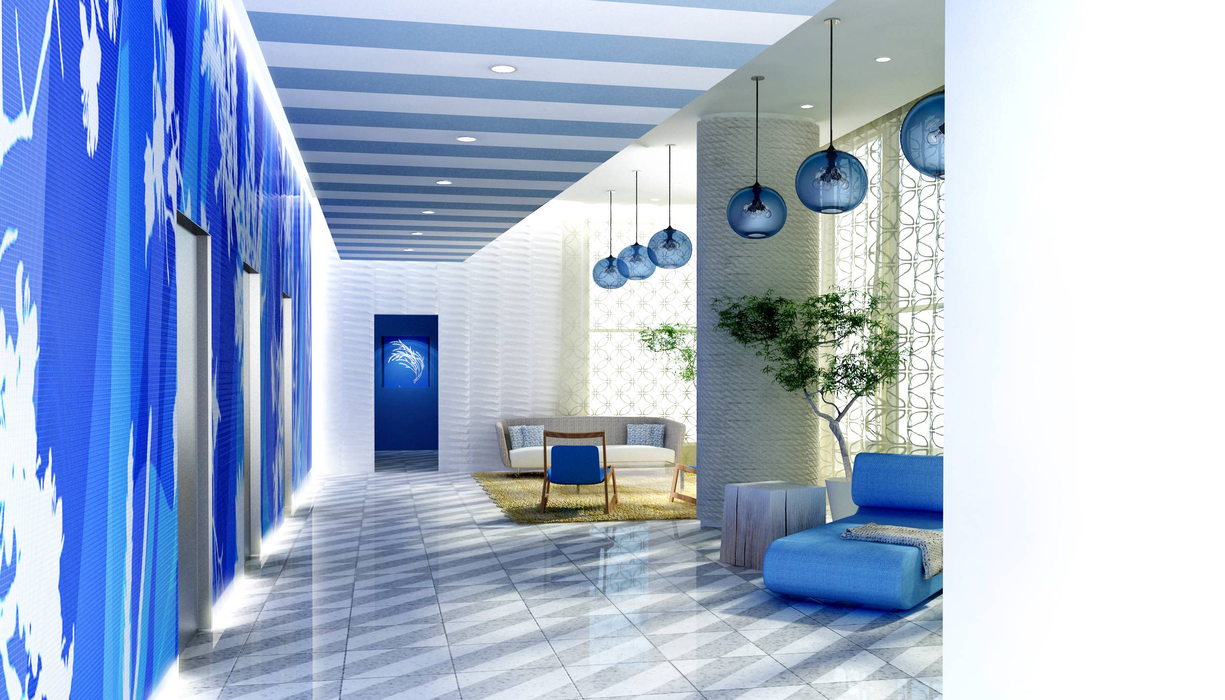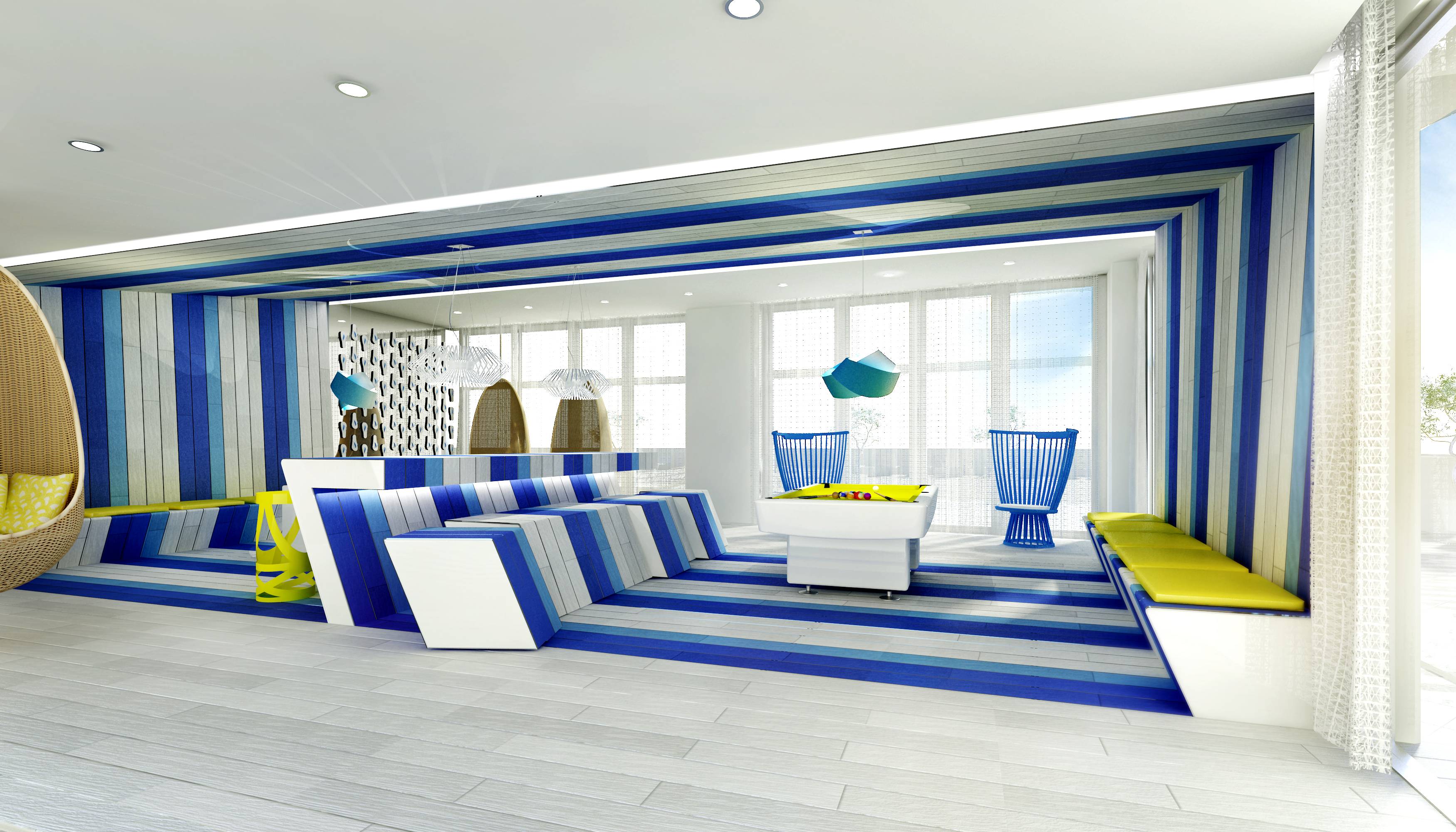 The elaborate social spaces are full of sophisticated architecture envisioned by renowned designer, David Rockwell. The terrazzo floor in the two-story lobby, textured walls and the custom-made mural of translucent and reflective glass collectively achieve the conceptualization of ocean living. The chic lines, blue accents and the occasional swinging wicker chair that encompass the lobby and lounge showcase the designer’s attention to detail.