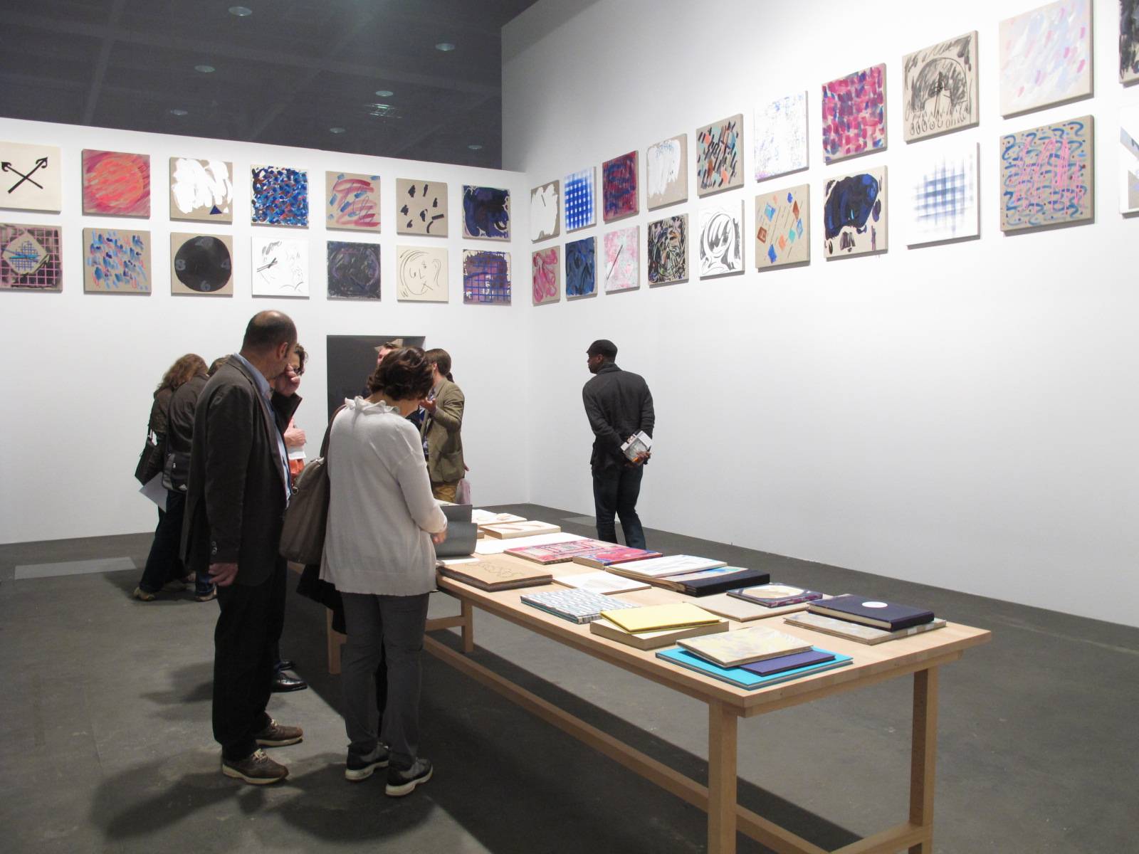 Laura Owens shows, with characteristic exuberant playfulness, that painting still makes an impact on par with oversized, obviously impressive sculptures. Entering her studio-like room of record-cover sized canvases, one is immediately taken by the gestural lines, layers of textures, dabbles of paint here and there. Owens doesn’t differentiate between play and “art”; every canvas is a separate world unto itself, with its own logic. Several paintings have a rotating hand meant to indicate either the passage of time or time’s relative absurdities. Fully illustrated books cover a long rectangular table, inviting viewers to flip through joyously human evidence of creativity.