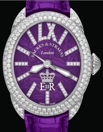 This special celebration comes to life on the dial of the timepiece. The Lord Chamberlain’s Office in Buckingham Palace granted Backes & Strauss London permission to use Her Majesty’s Royal Cypher “EIIR,” which, complete with Crown, appears on the dial. The base features outlines of English roses, appropriately lacquered in Royal purple. Diamond-set numerals bring the dial to brilliant life, as does the optional one or two-row ideal cut diamond setting.
