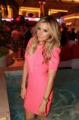 Actress and singer Ashley Tisdale arrived around midnight with her sister Jennifer and some friends and partied in splendor in a luxury bungalow overlooking the packed pool party scene. Party onlookers commented that the former “High School Musical” cast member spent a lot of time on her phone, when she addressed her 7 million Twitter followers. She was wearing a pink dress with a plunging neckline covered by sheer fabric. This is the same dress that Brittany Spears recently rocked on the hit TV show “The X Factor.”