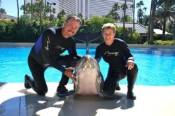 Comedian Bill Engvall and his wife Gail were spotted at Siegfried & Roy’s Secret Garden and Dolphin Habitat on Saturday. This marked the couple’s third visit to the animal oasis at the Mirage. The two swam with the dolphins and left with a close friend in Maverick, the habitat’s 9-year-old bottlenose dolphin.