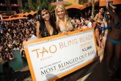Gretchen Christine Rossi of “The Real Housewives of Orange County” hosted Bling Beach at Tao Beach at the Venetian, giving the girl with the most blinged out swimsuit a $5,000 prize. The reality star posed for a few photos on the red carpet, rocking a custom Marco Marco swimsuit, Steve Madden heels, Beach Bunny wrap and Royal Asscher ring.