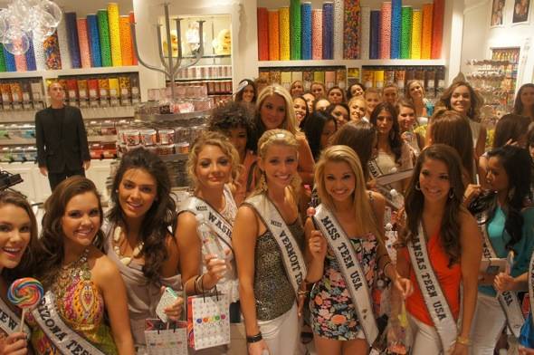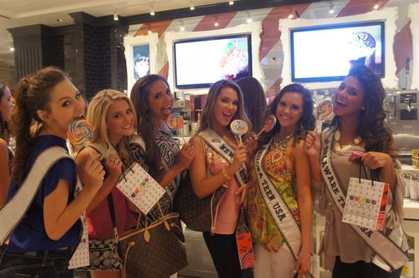 The 2012 Miss Teen USA contestants showed off their sweet side at Sugar Factory at Paris Las Vegas on Saturday evening. The blushing beauty queens were all smiles as they stocked up on delectable treats including Sugar Factory’s signature jumbo whirly pops, gummy bears and mouthwatering milk chocolate S’Mores candy bars.