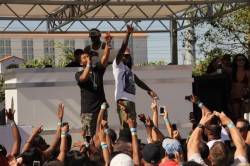 Bikini-clad babes rushed the stage for Wale’s performance of his go-go-inspired hip-hop beats at the outdoor adult playground. Sporting a yellow and pink Leaders cap, T-shirt, camo pants and a gold chain, Wale took the stage opening with his hit “Chillin.” The crowd erupted when he yelled, “I want to slow it down now for all these ladies” and Wale started singing his popular hit “Lotus Flower Bomb” while women lined the stage and grabbed at him as he walked by. The party went late into the day while guests danced to Wale’s other hits including “The Guilty Pleasure” and the Tyga “Rack City” remix.