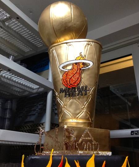On Saturday night, Bamboo welcomed “Big Three” trio James, Bosh and Wade with a Divine Delicacies cake replica of the Larry O’Brien NBA Championship trophy in tow. Emblazoned with sparklers, the nearly 5ft. cake also included a miniature jersey for each of the players.