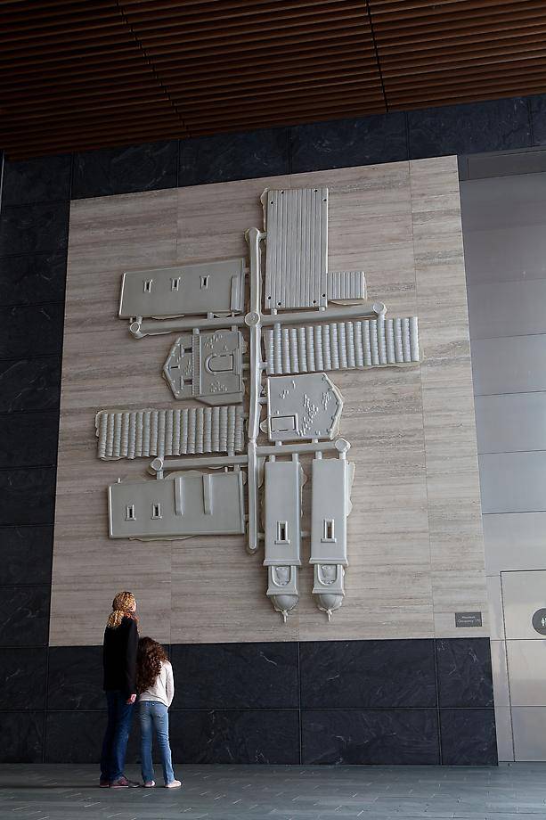 Located in Millennium Tower’s light-filled public atrium, Yoram Wolberger’s CA Mission (2011) depicts California’s iconic Spanish missions in the style of a ready-to-assemble children’s toy model. Spanning 18 feet by 14 feet, the fiberglass and steel sculpture references California’s architectural heritage and notions of mass production. Wolberger’s past work includes a “Cowboys and Indians” series of life-size Wild West figurines. CA Mission marks Wolberger’s first public commission.