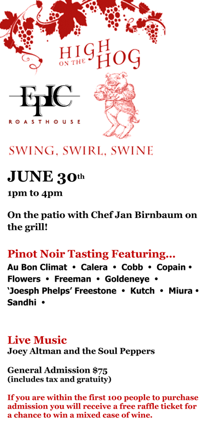On Saturday, June 30, Epic Roasthouse hosts a signature fun-filled outdoor event, High on the Hog. For $75, guests will enjoy Chef Jan Birnbaum’s cooking on the grill while sipping on Pinot Noir from a variety of wineries.