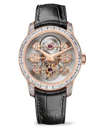 The dial is adorned with three gold bridges intended to offer a grounded sense to the wearer of this otherwise whirlwind design. Thirty-one jewels adorn the face of the watch, accenting the craftsmanship of Girard-Perregaux’s artisans. Its case is crafted in rose gold, with a diameter of 41mm. An alligator skin strap with a folding 5N18 gold clasp keeps the Tourbillon securely on the wearer’s wrist, in addition to complementing the curved case.