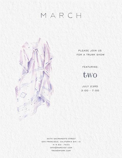 The trunk show show, hosted by MARCH, will feature Two’s collection of feather-weight, Montauk-ready caftans and dresses by Bay Area native and Prada veteran Monica Patel-Cohn.