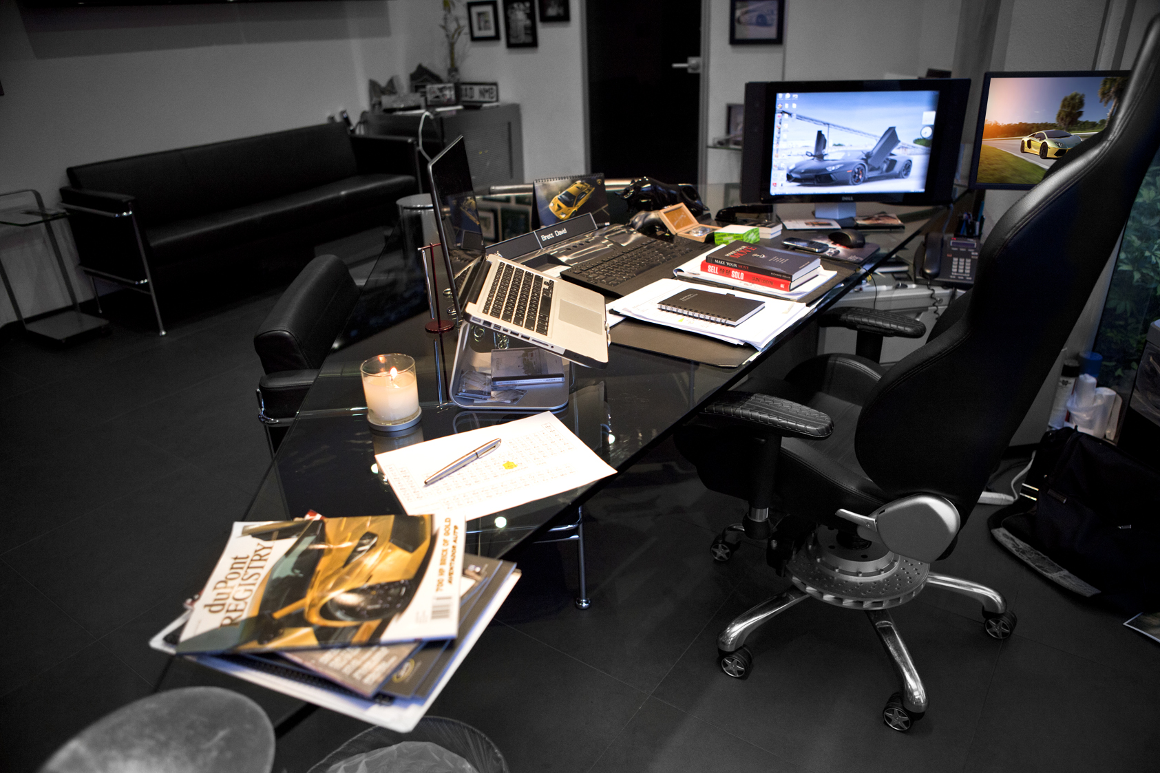 • Chair: this is a special design that was inspired by the RECARRO brand. This chair forms to my back like a high performance sports car we sell. Believe it or not this chair has started more conversations and sold more cars than I would have imagined…but a chair is just a chair.