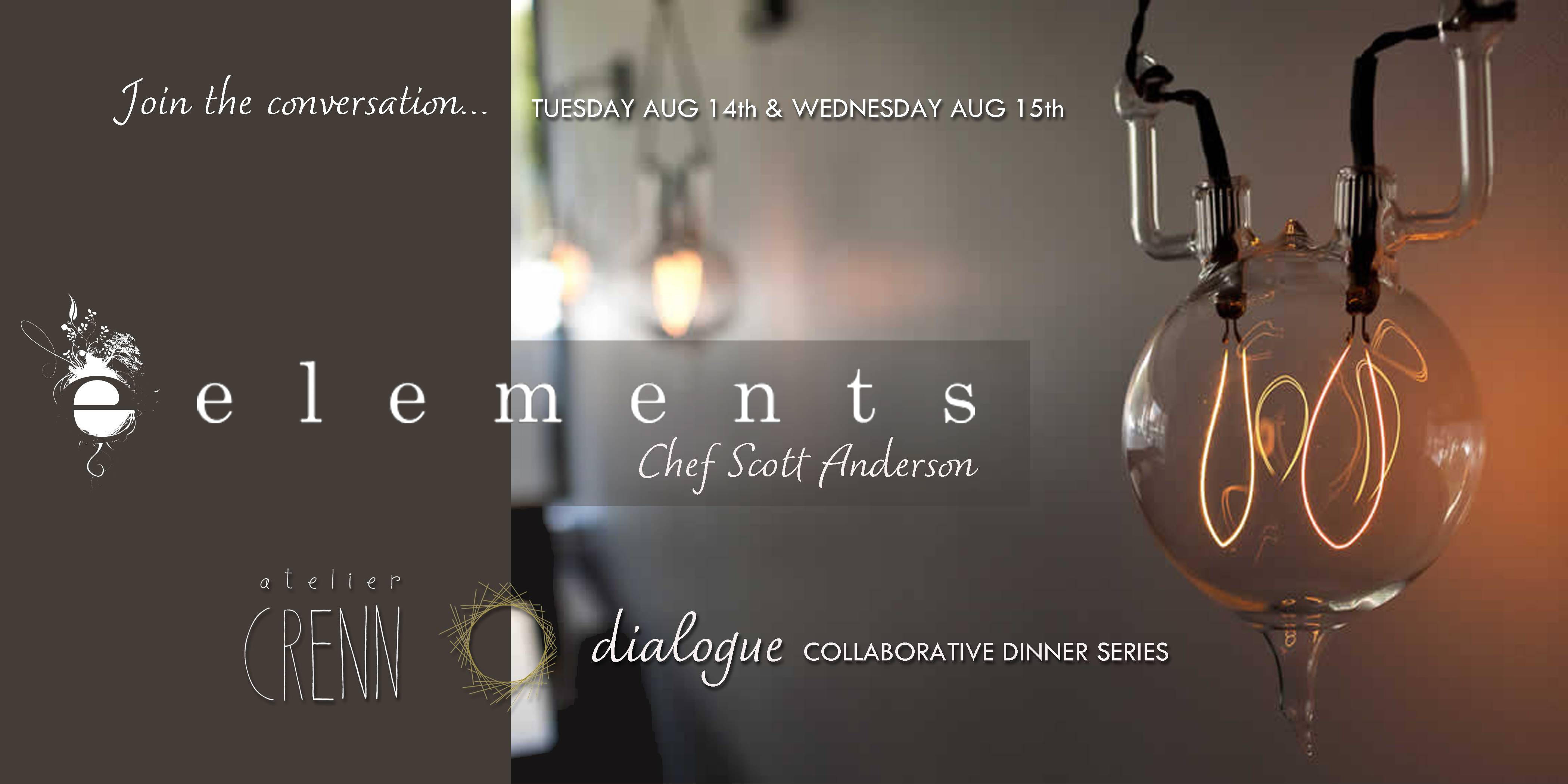 For the fourth installment of Chef Dominique Crenn’s dialogue series, Michelin rated Atelier Crenn welcomes Chef Scott Anderson of Elements on August 14thand 15th. Both evenings will consist of a 10-course menu with alternating dishes from each chef.