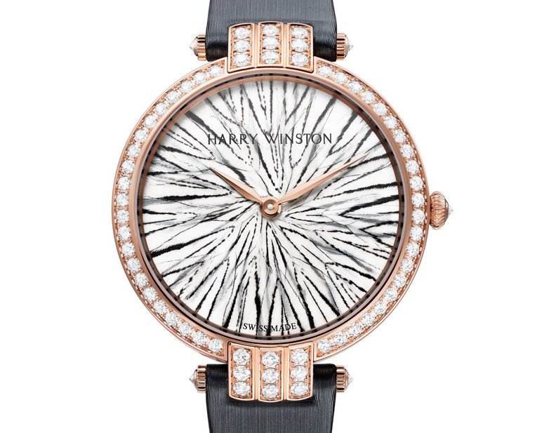 The art of feather marquetry involves selecting feathers from exotic species of birds and artistically arranging them on the face of a timepiece. All the rage in the courts of European royalty during the 1800’s, master artisan Nelly Saunier is reviving the art in four variations for Harry Winston.