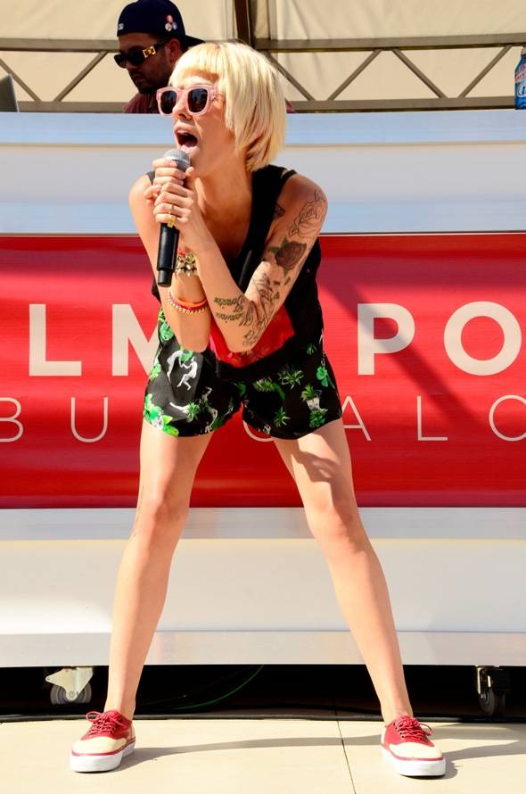 Sporting a black and red see-through tank-top, black and green high-waisted shorts, pink wayfarers and spikey jewelry, DEV and a group of her friends partied in their cabana after her performance. Later she was joined by dubstep deejay Rusko and the group drank Miller Lite and Ketel One cocktails while snacking on sliders, chicken Caesar wraps and fish tacos. The group stayed late into the afternoon until the pool closed for the day.