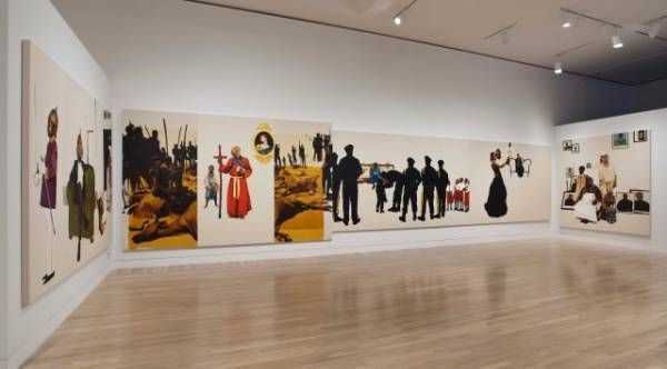 Ann Philbin the Museum’s director just loves Mokgosi’s work that has been displayed around three walls filled with 10-canvases in a series. The director describes his work as “beautiful and brutal.” She goes on to explain “His work is a form of historical painting that comes from various stories of postcolonial Africa. We might not know the particular references to slaughtering cows in the 19th century, but we do feel the tension and understand that they are paintings about resistance.”