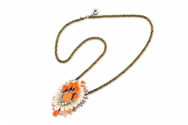 The fine jewelry collection includes necklaces and brooches made of brass, enameled stones, embroidered natural stones, leather, Shanghai Tang textiles and Swarovski Elements once inspired by contemporary pop and Chinese symbols, but now recently inspired by “The Dragon Plateau,” Shanghai Tang’s A/W 2012 women’s ready-to-wear collection.