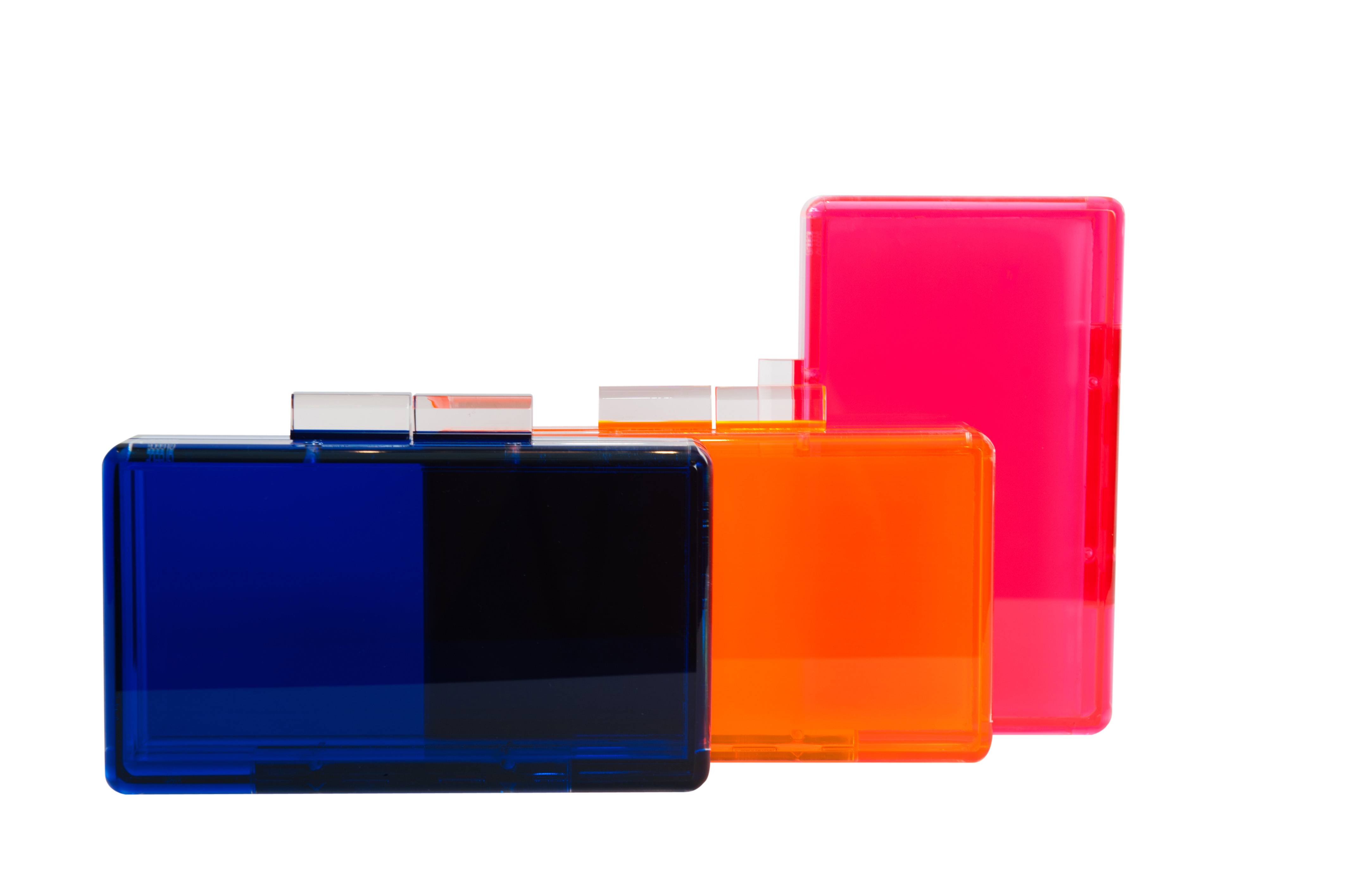 Each clutch bag is made with Plexiglas material and combines bronze metal in some detailing. A wide variety of colors are available allowing for use at a range of social occasions. The designer is also planning for a more complete collection not only with her clutch bags, but also including day bags, bangles, bracelets, earrings, necklaces and some special outfits all using Plexiglas as main material.