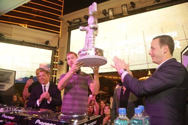 The resident DJ began his set shortly after 1 a.m. when he was surprised on stage by XS managing partner Jesse Waits with a giant cake in the form of the iconic hardware. Harris was stunned by the presentation.