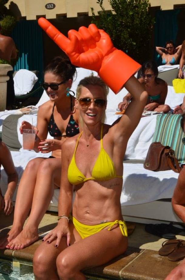 Newly single Jennie Garth wowed the crowd in a neon yellow string bikini showing off her amazing beach body. She jumped into the DJ booth with Danny Masterson and actor Michael Pena, who talked to Garth about his new movie “End of Watch,” which co-stars Jake Gyllenhaal.