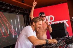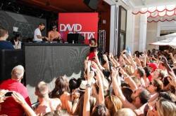 Phelps and Schmitt then worked their way down past the pool where they greeted fans and got numerous pats on the back before joining Guetta in the DJ booth. The crowd roared with excitement and spontaneously began chanting “USA! USA! USA!” as the Olympians beamed with pride, grinning from ear to ear, soaking it all in. The excitement continued as Steve Wynn and his wife Andrea Hissom entered the DJ booth and joined in the memorable moment.