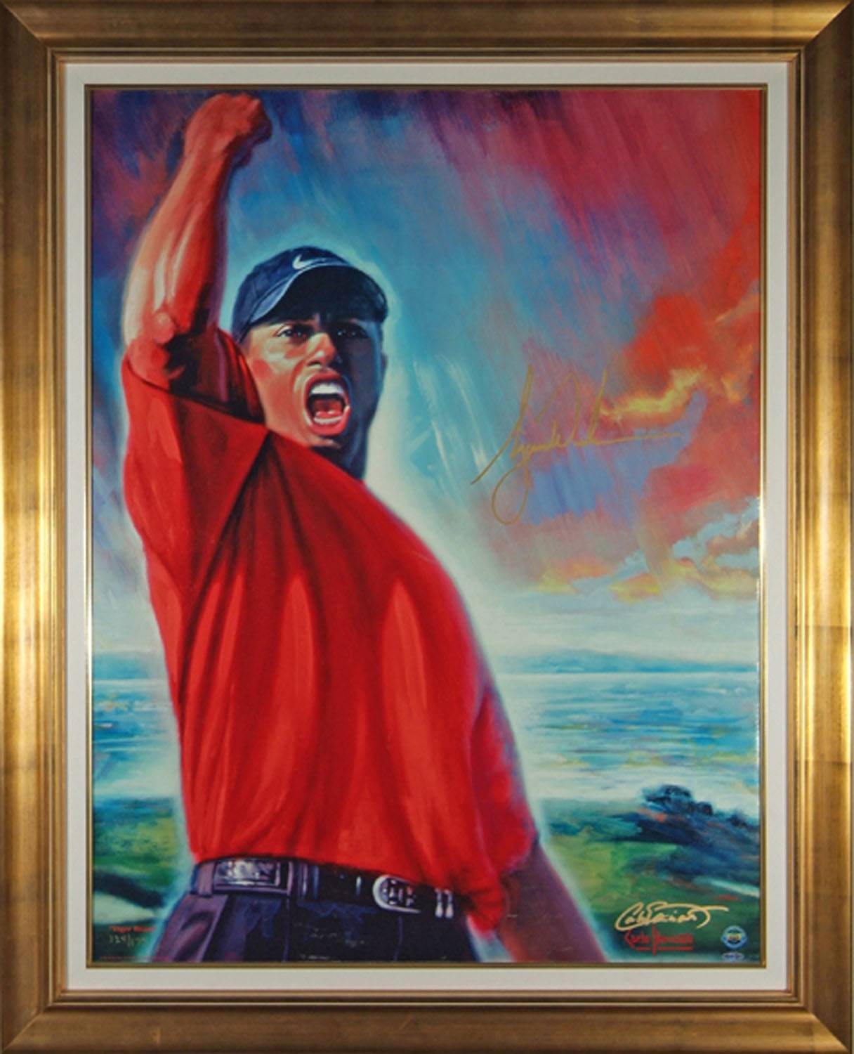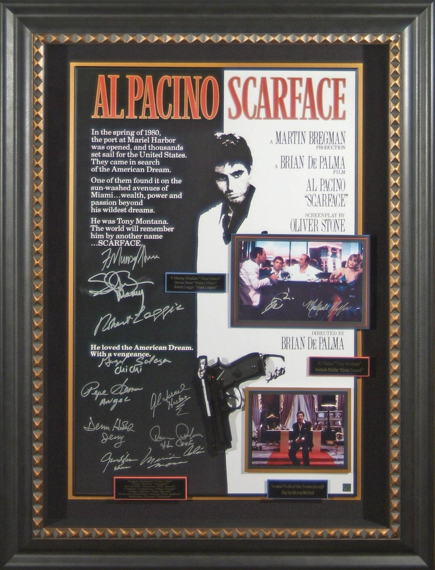 Pieces include an authentic hand-signed autograph of Tiger Woods and famed artist Carlo Beninati on canvas painting ‘Tiger Roars’; a framed Scarface display with a movie prop featuring the authentic hand signatures of the cast of Scarface including Al Pacino, Michelle Pfeiffer, F.Murray Abraham, Steven Bauer and others; a framed Godfather display with a movie prop featuring signatures of the cast including Marlon Brando, Al Pacino, director Francis Ford Coppola and James Caan. Other notable memorabilia include Pulp Fiction, Gladiator, Braveheart, Walt Disney, Muhammad Ali, Indiana Jones, Top Gun, Lionel Messi and Roger Federer, to name a few. All items come ready-framed, along with a lifetime credible guarantee of authenticity, just pick and choose and have it delivered to take pride in your cabinet or wall.