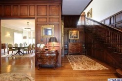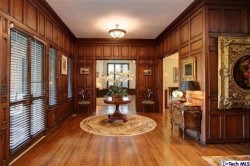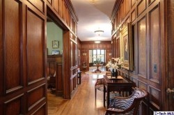 The home features six bedrooms, five-and-a-half baths, a library, a sunroom, a formal dining room, oak-paneled walls, mahogany, oak, marble and Batchelder tiled fireplaces, a butler’s pantry, a gym, a game room, an outdoor kitchen and patio area, a swimming pool, a three car garage and a two-bedroom guest house with a kitchen.