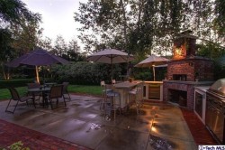 The grand foyer leads in a living room with fireplaces. There is also a sunroom that overlooks the pool, a kitchen with a center island and a master bedroom with a fireplace on the second floor. The outdoor kitchen/patio area features a pizza oven.